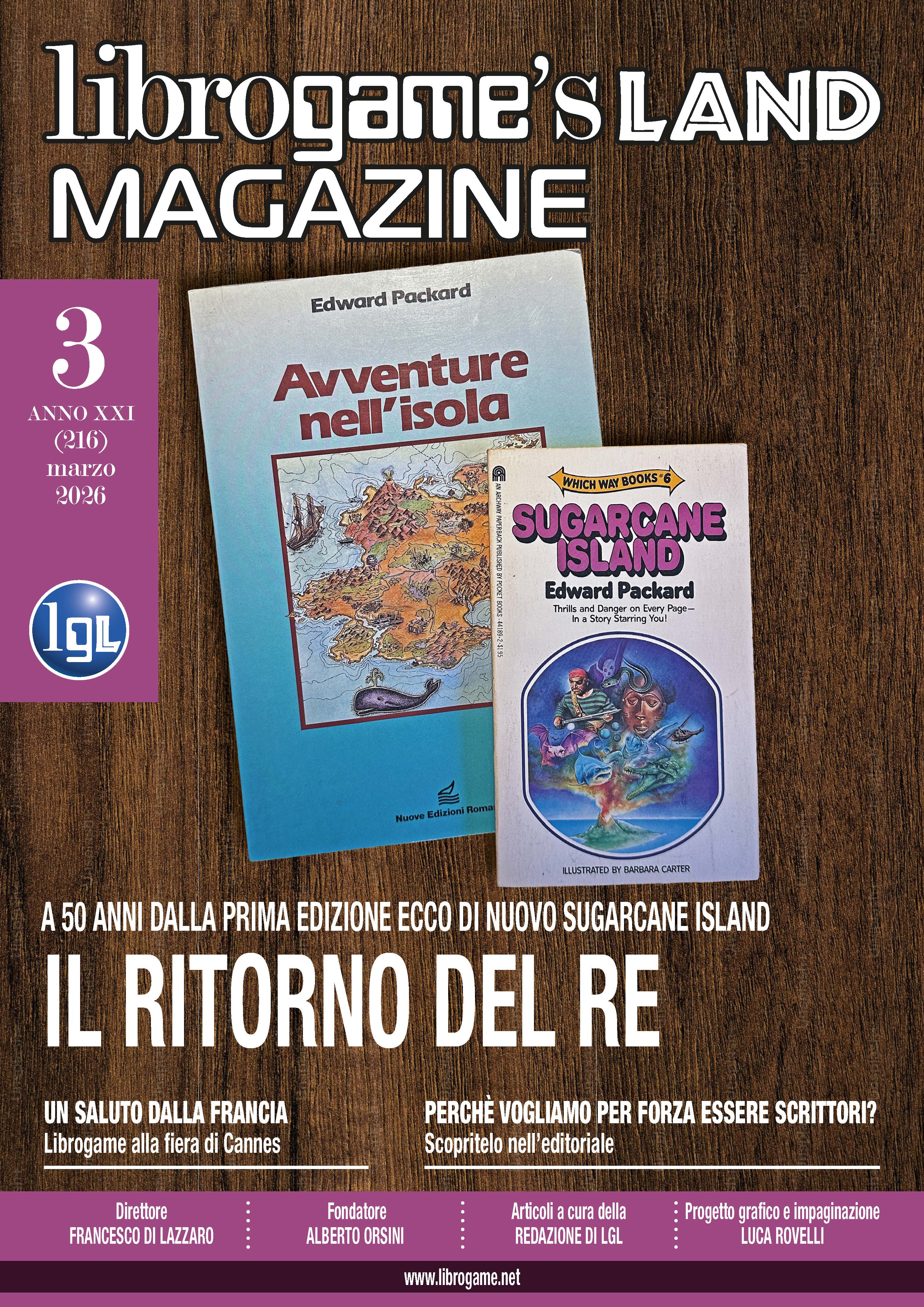 Salutiamo la primavera e le giornate che si allungano con il nostro periodico, perfetto per introdurre uno dei periodi più belli dell'anno. Anticipiamo una delle novità che vedremo a play 2026: dopo 50 anni esatti dalla sua prima pubblicazione, e a 44 dall'unica, precedente, edizione italiana, torna Sugarcane Island, quello che da molti è considerato il primo vero lg della storia nonché il primo pubblicato nel nostro paese. La nuova edizione sarà ricca di sorprese che potete scoprire nell'articolo dedicato, che ospita anche la riproposizione di una storica intervista all'autore, Ed Packard. A seguire il reportage della fiera di Cannes, LGL sbarca anche in Francia. Kermesse che, a dirla tutto ha offerto pochino sul piano dei puri bivi, ma tant'è. In apertura poi un'autentica chicca, un editoriale che risponde, con il solito stile tagliente del nostro Zakimos, a un'annosa domanda: perché molti di noi vogliono per forza essere scrittori? I pezzi sono di Francesco Di Lazzaro, Alberto Orsini e Marco Zamanni, la parte grafica e l'impaginazione sono a cura di Luca Rovelli; trovate la rivista, in versione .pdf da scaricare nella nostra sezione Magazine. Per domande e commenti vi rimandiamo al thread dedicato sul forum.
